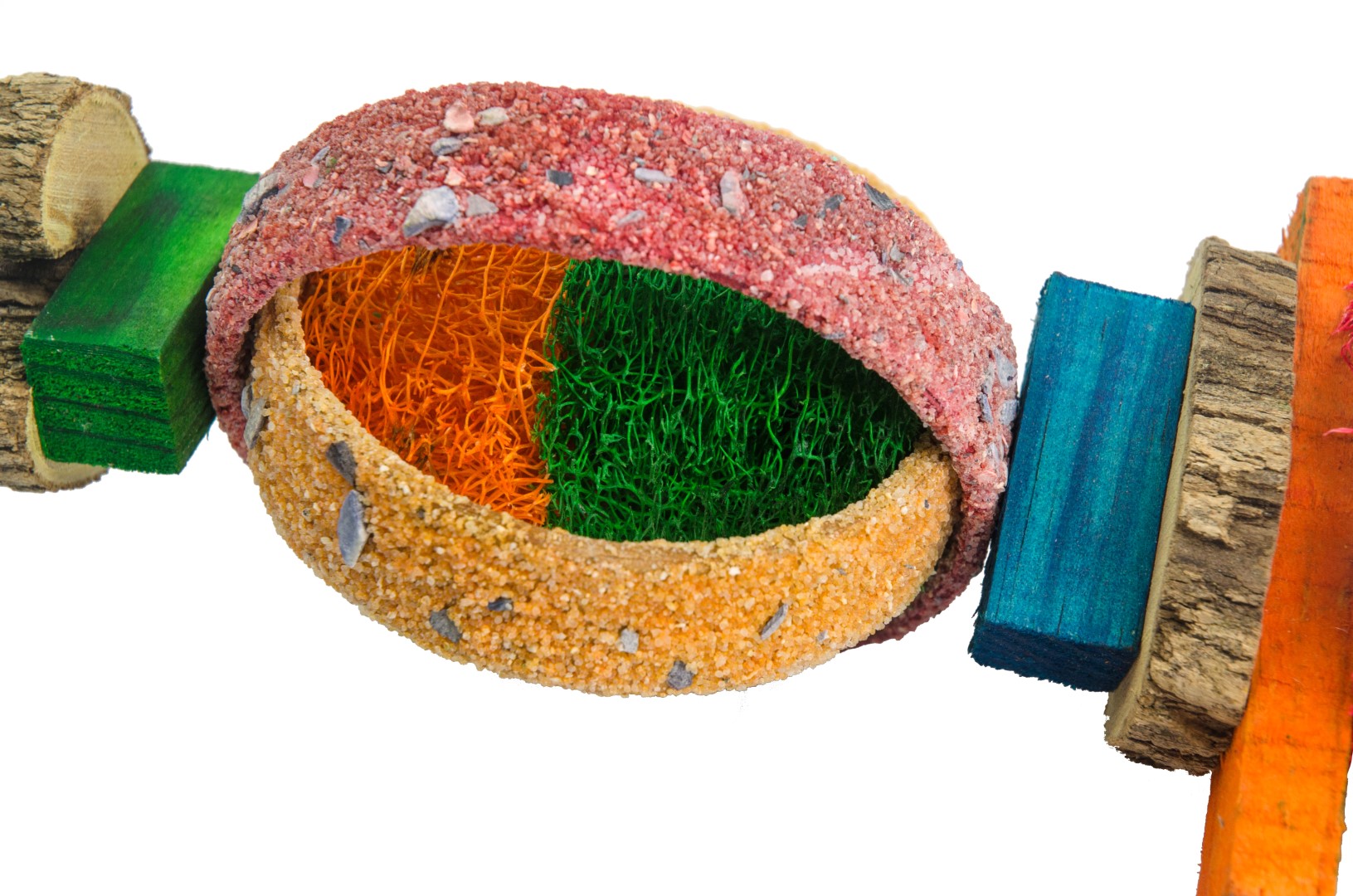 Draagt bij aan het onderhoud van de pootjes en snavel van uw vogel. Makkelijk te monteren met behulp van het karabijnhaakje. Bevat luffa, rondjes met zandstructuur, gekleurd hout en een leuke bel aan de onderzijde voor extra speelplezier.