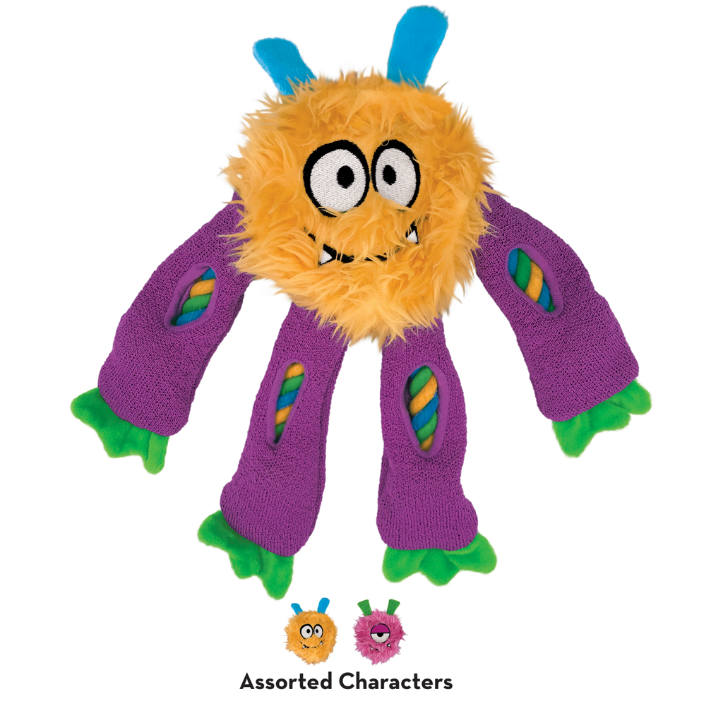 Sneakerz Knots’ sturdy internal rope features a rope knot in the head that extends through the legs providing an outlet for appropriate chewing behavior. Unique, peek-a-boo windows pique curiosity and extend the engagement with foraging fun. Long, dangly legs are great for shaking play and a grippy tennis shoe material legs squeak for interactive tugging playtime galore with these grinning pals.